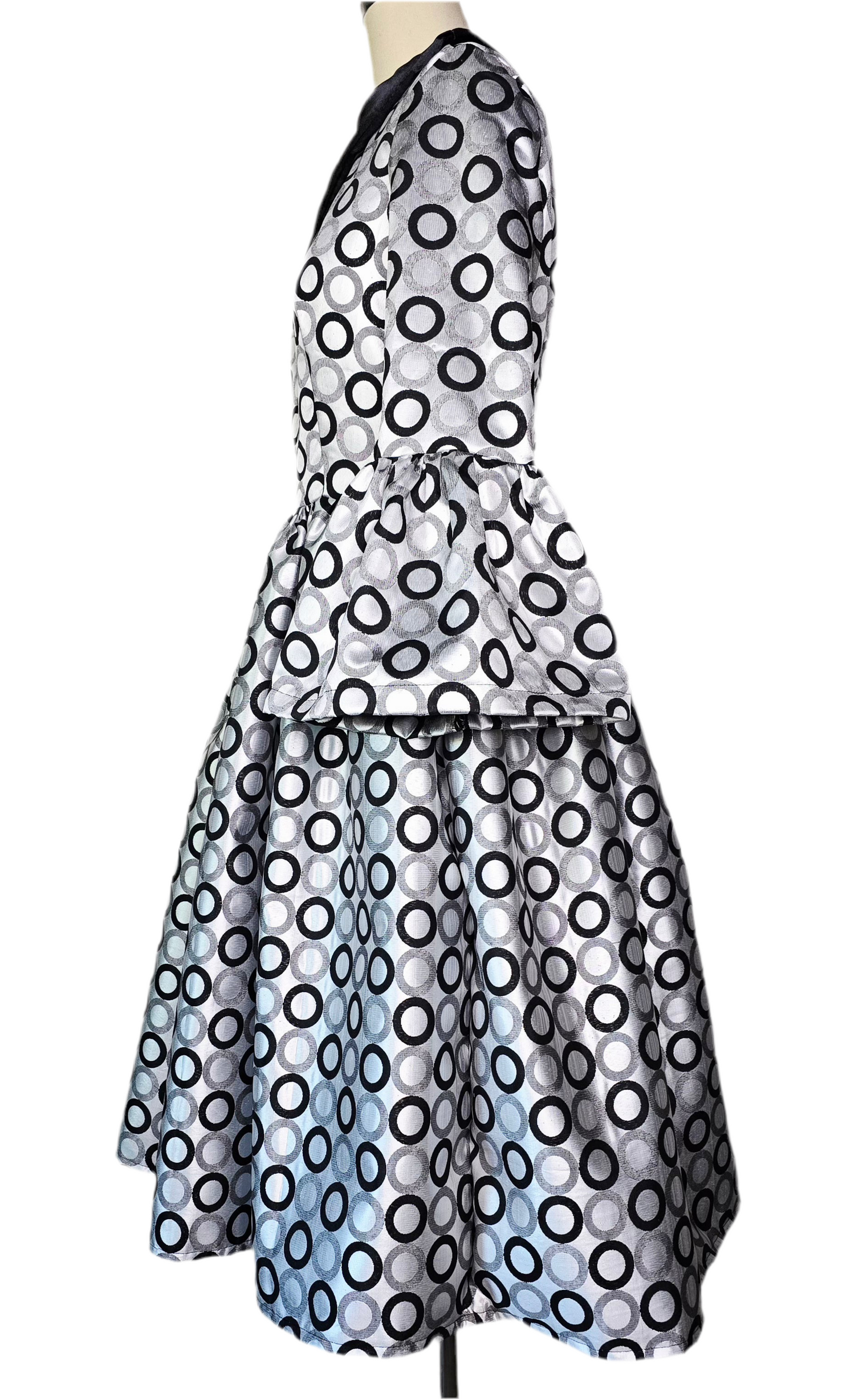 This playful yet polished printed midi dress balances whimsy and refinement. The geometric circle motif in ivory and charcoal is bold yet wearable, while the voluminous sleeves and satin collar nod to couture elegance.