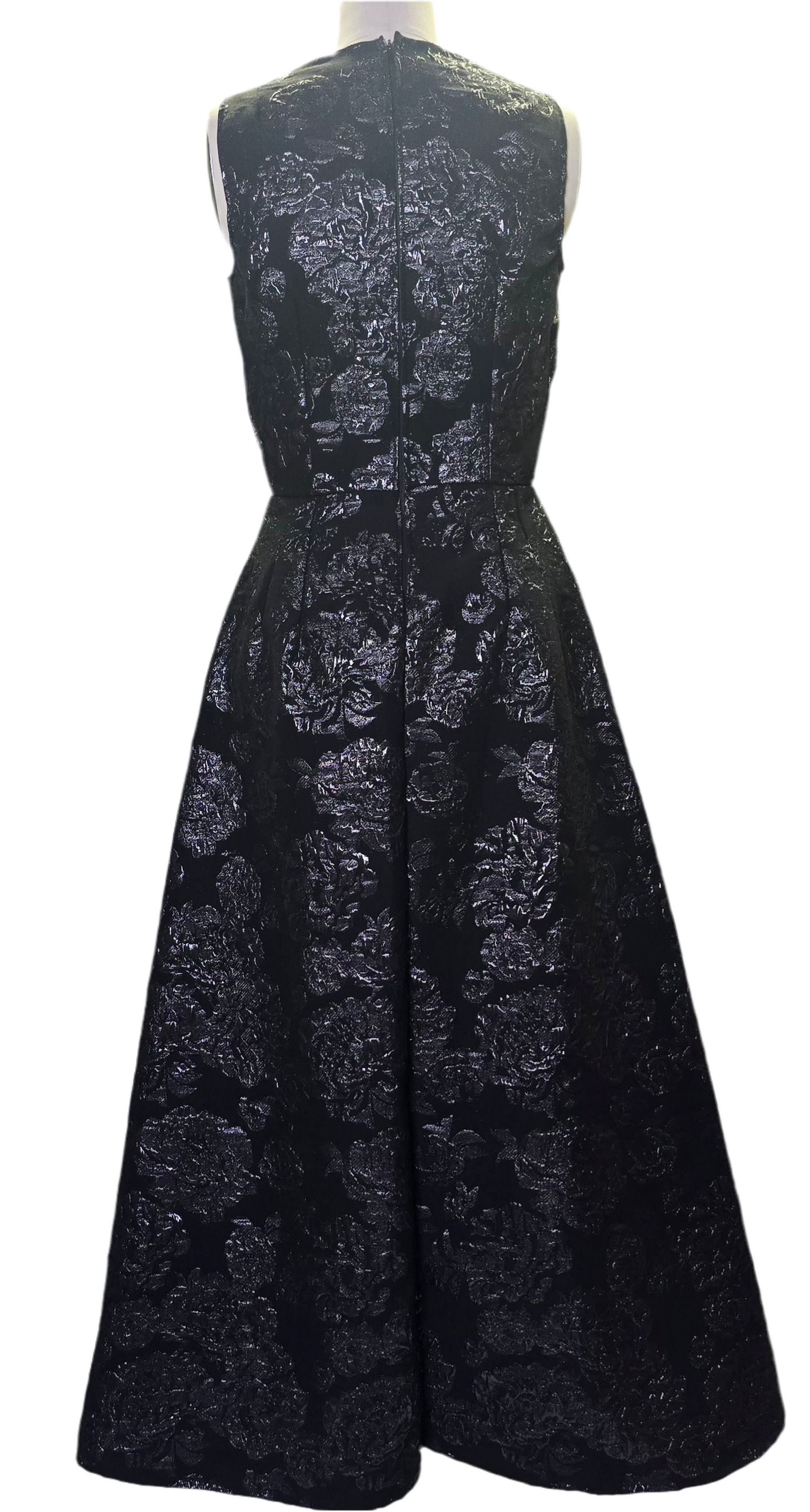 A masterpiece of couture elegance, this sleeveless black brocade dress is tailored to perfection. The fabric shimmers with intricate floral textures that catch the light with every movement. Fitted at the waist and dramatically flared to the floor, it creates a graceful silhouette that commands attention.